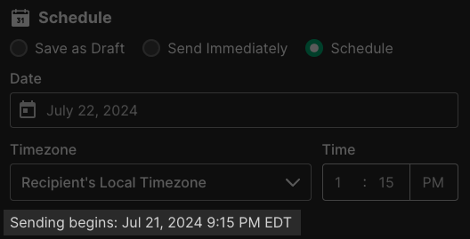 You can schedule a campaign to send to all contacts simultaneously or at a specified time in their local time zone. For example, if you schedule a campaign to send at 9 AM your time (EST), contacts will receive the campaign at whatever time 9 AM EST is in their time zone.
