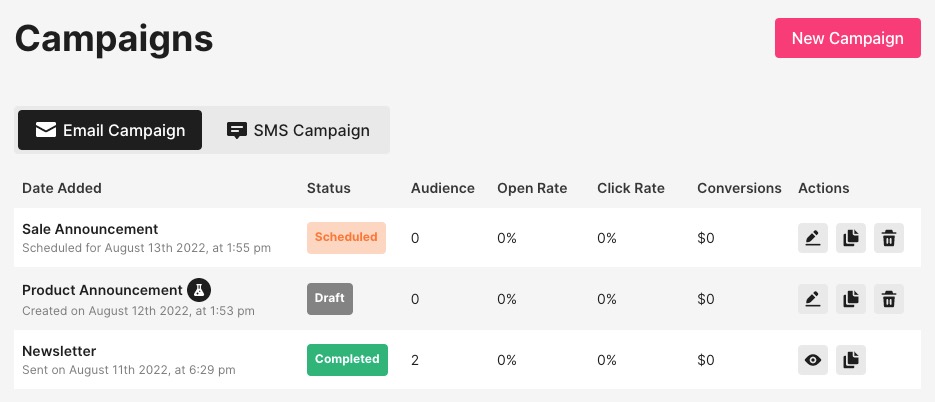 • Duplicate - Create an exact copy of a campaign including all settings, audience, and content details.