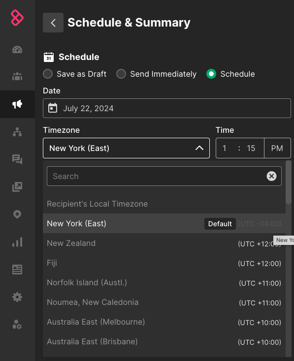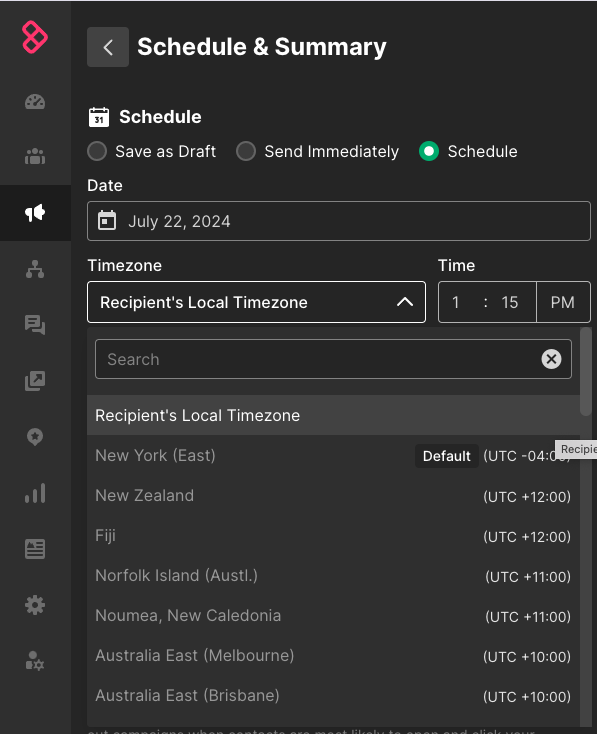 To send a campaign to all recipients at the same time in a specified time zone, select a time zone from the Time zone dropdown (your account's time zone is noted as Default) and set your preferred time: