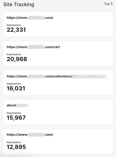 The Site Tracking section shows the top five Beacon events on your website by the number of total visits, or Impressions. Impressions count each page view even if the same Contact visits the page multiple times.