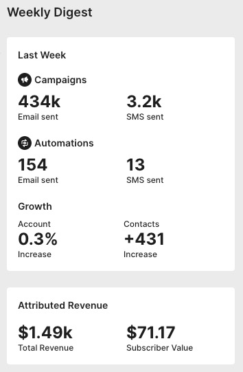 The Weekly Digest sidebar is a great way to see a quick overview of your entire Sendlane account. The information here refreshes weekly at midnight on Sundays EST, regardless of the time zone your account is set in.