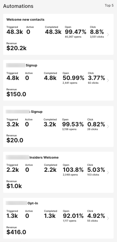 In the Automations section you'll see your Top 5 Automations, including the number of times the automation is triggered, how many contacts are currently active within the automation, how many contacts have completed the automation, the open rate, click rate, and revenue (if any) of each automation.