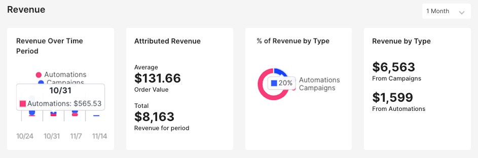 The Revenue section provides an overview of revenue earned from Automations and Campaigns