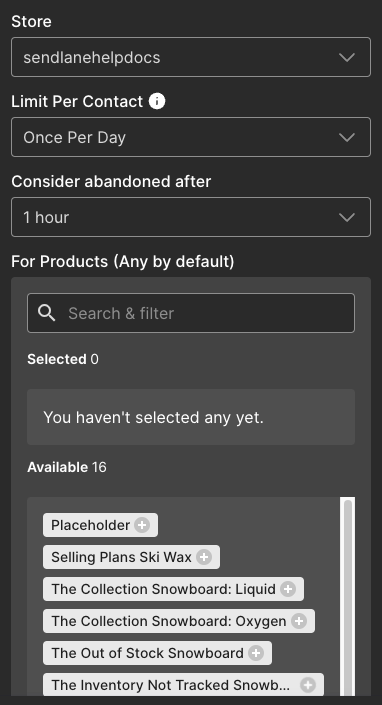 You can specify individual products that should trigger the automation by searching for and selecting products in the For Products section of the trigger settings. If you do not select any specific products, all products will trigger the automation.