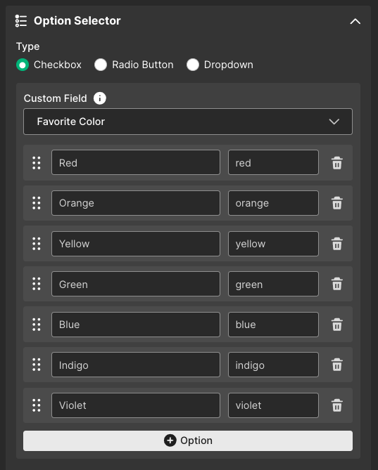 Let's say you've created a checkbox option selector to collect your contacts' favorite colors like this: