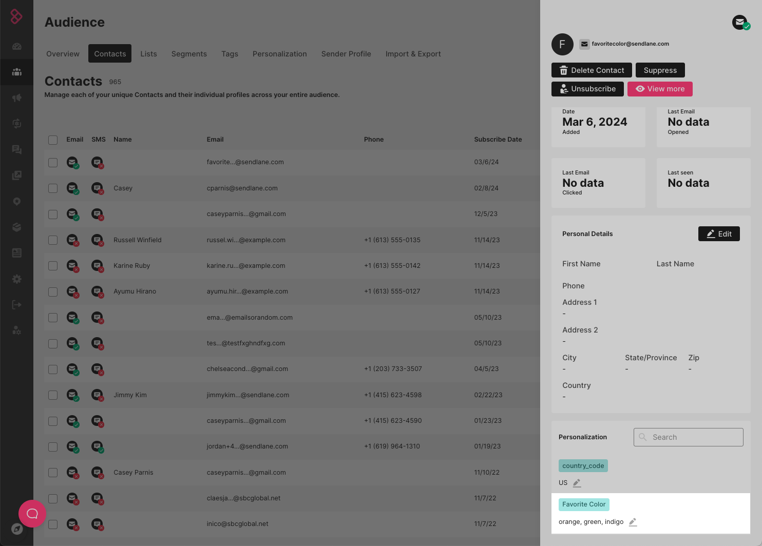 A contact who selected Orange, Green, and Indigo will display those selections in the Personalization section of their contact profile under the Favorite Color custom field: