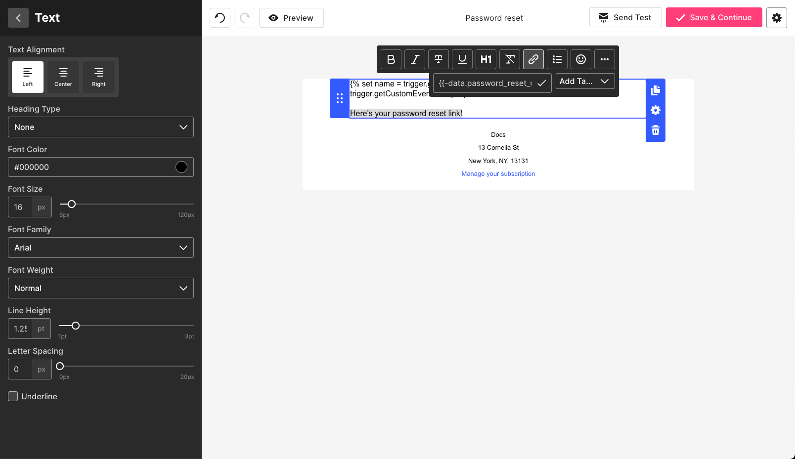 }Now that we’ve set up our data variable, we can access the password_reset_url via templating syntax: