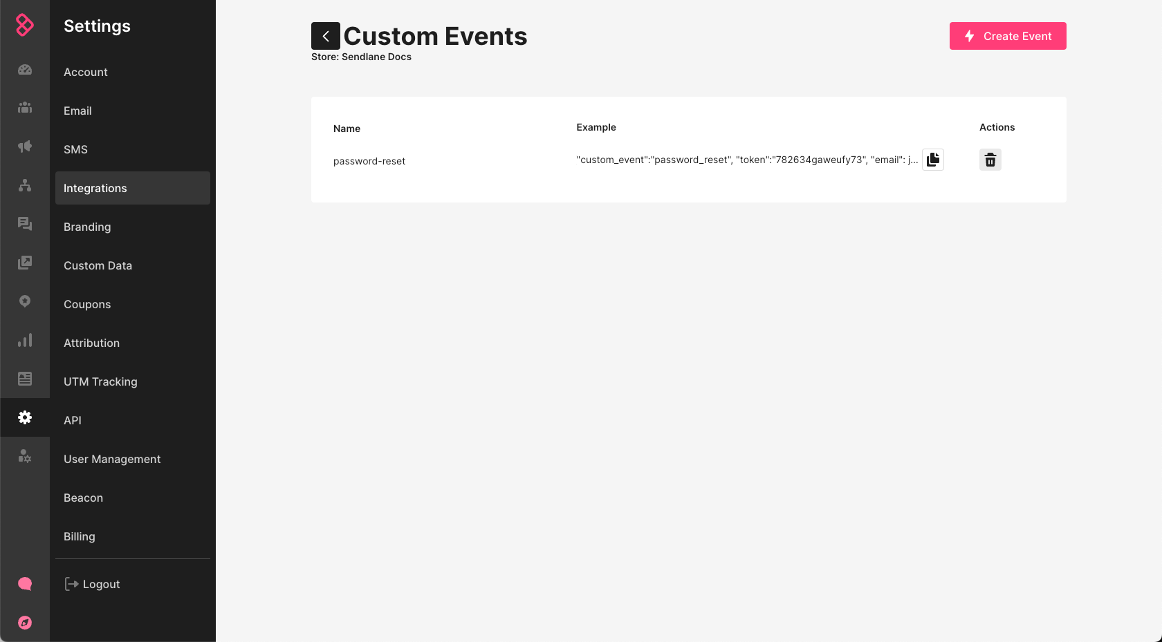 token- Grab the token associated with your custom event by heading to the Sendlane Custom Integration page > Click Settings > Click Copy > Paste in place ofCUSTOM_EVENT_TOKEN
