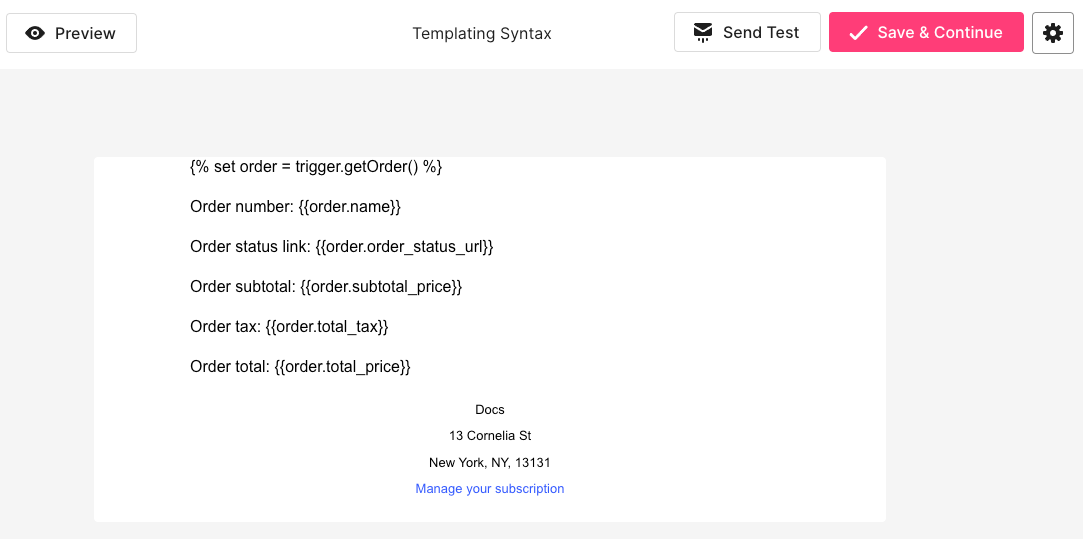 You can use templating syntax to insert dynamic data from the payloads of events that trigger certain Shopify automations. Read on to learn about how to use templating syntax in Shopify automations.