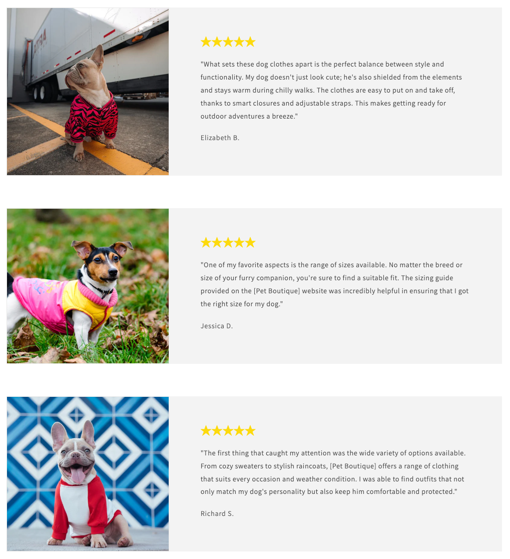 Shopify's image with text block is a great way to display multiple hand picked reviews with images. Read about Shopify's image with text block for detailed information about the available customization options!