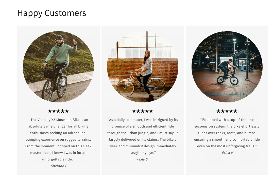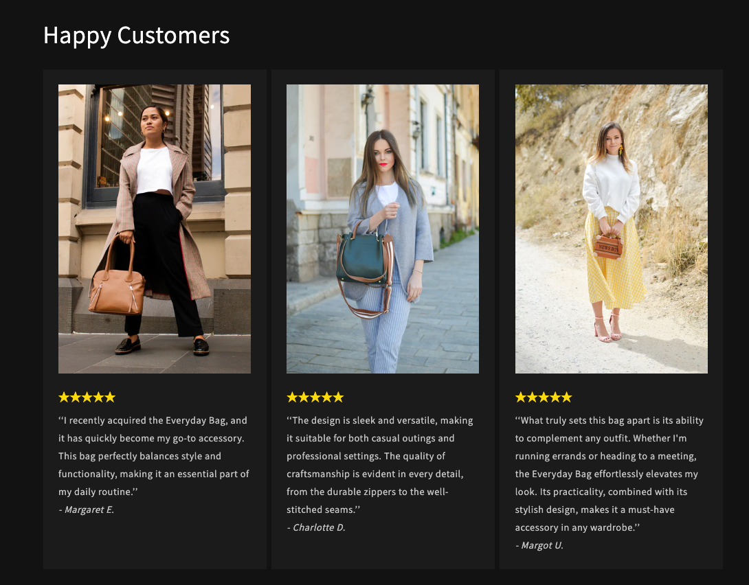 Shopify's multicolumn block is a great way to display multiple hand picked reviews with images. Read about Shopify's multicolumn block for detailed information about the available customization options!