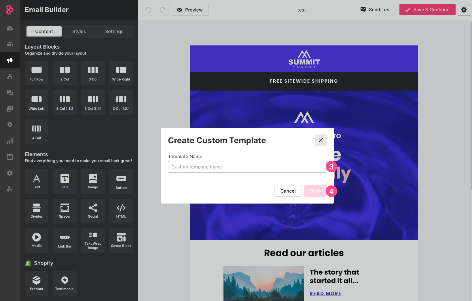 Open a campaign or automation email and edit its content. To save an email as a template: