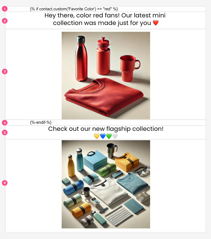 {% if contact.custom('Favorite Color') == "red" %}A text block containing copy intended for recipients whose
