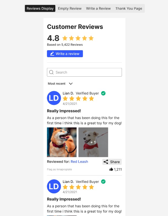 Sendlane’s product review widget makes it easy to customize the look and feel of your store’s product review widgets, empty reviews, review request page, and thank you pages to match your store’s branding! Set custom settings and style options for each state of your reviews widget on mobile and desktop:
