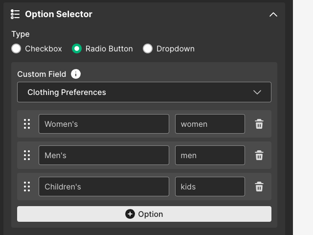 For example, let’s say you want to collect your contacts’ clothing preferences. You could set up your option block like: