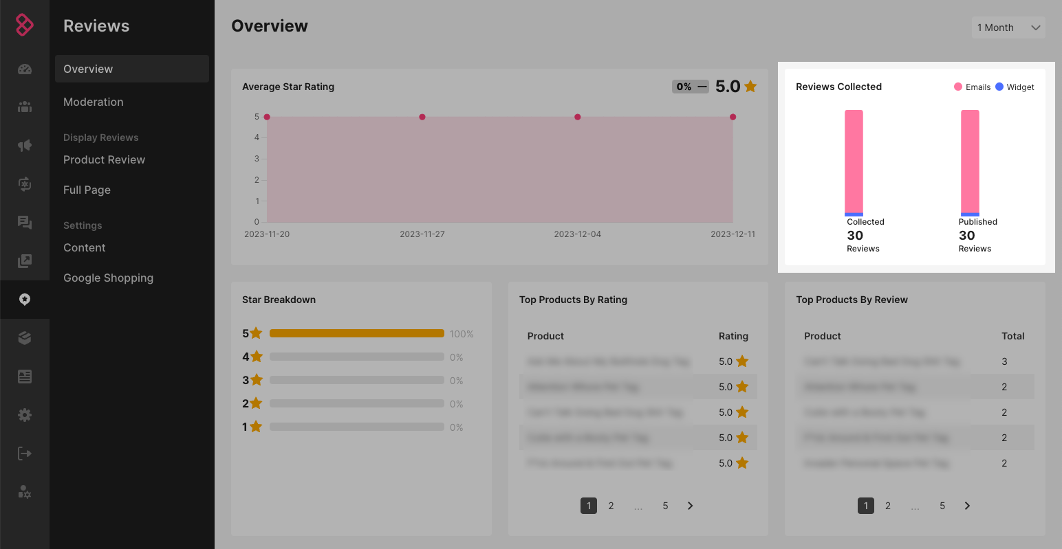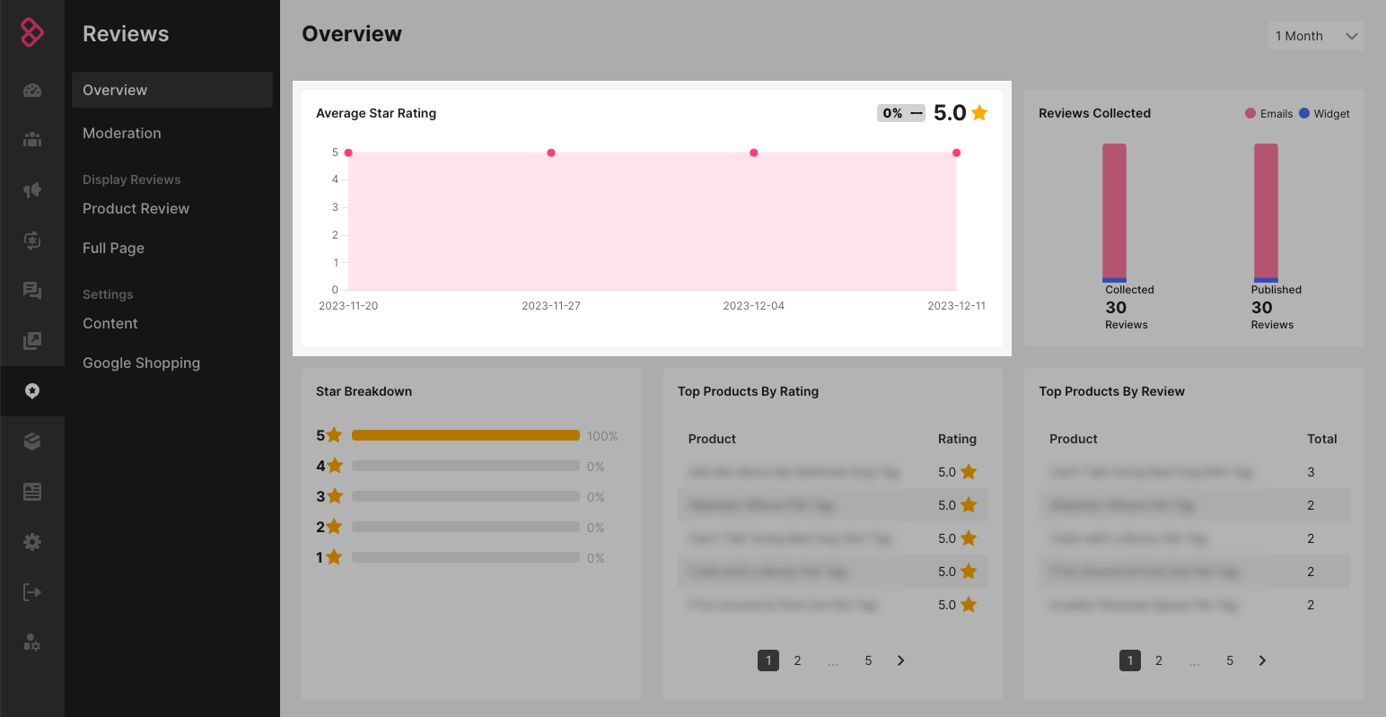 The Reviews dashboard is full of valuable insights about the product Reviews you've collected; including your store's overall average star rating, the number of reviews you've collected and where they were collected, the number of reviews in each star rating "bucket," top products by star rating, and top products by the number of reviews. Read on to learn more about Review reporting!