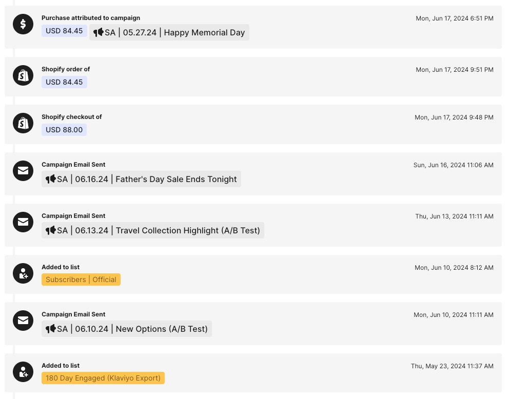 This means you may see an order attributed to an older message in a contact's profile without seeing an open or click record. In the example below, an order from June 17th is attributed to a campaign sent on May 27th. Even though we can't see it on the contact profile page, this contact did open the May 27th message within the attribution window settings.