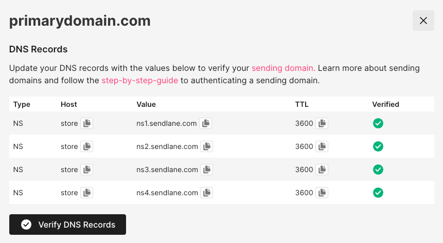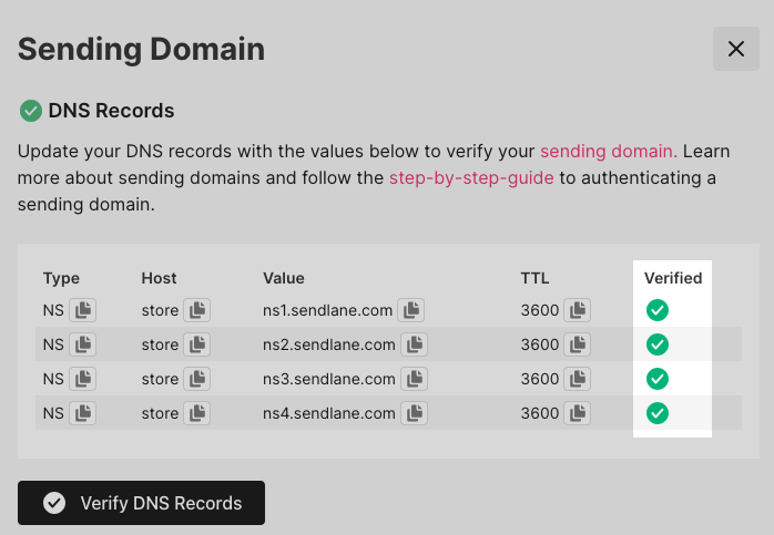 If you see NS records on the sending domain slideout window, but your website's host doesn't allow you to add new NS records, contact your customer success manager or Sendlane support. We'll set you up with the DNS records you need!