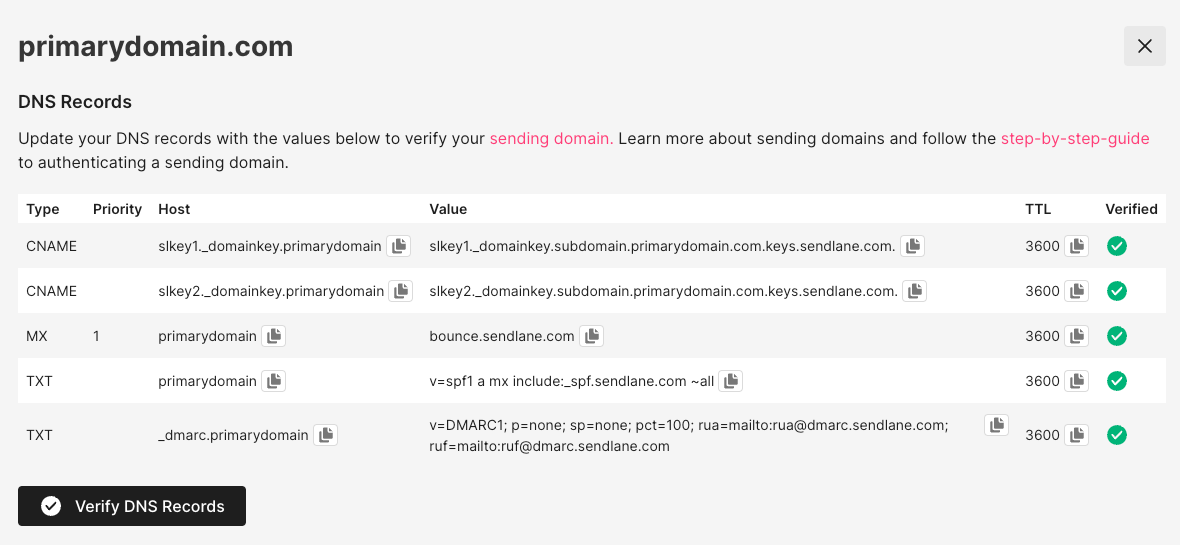 Once you’ve added the DNS records provided by Sendlane to your DNS panel, click Verify DNS Records. You should see a new Verified column with green checkmarks next to each record, indicating that the records were added correctly.
