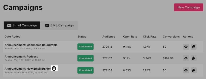 Identify campaigns that ran experiments by the experiment icon next to the campaign name