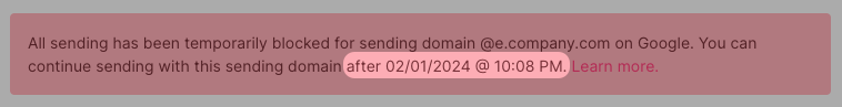 When your sending domain is temporarily blocked for a certain inbox provider, campaigns that were in progress when the block began and any that start before the block is lifted will not be sent to contacts who use the specified inbox provider.