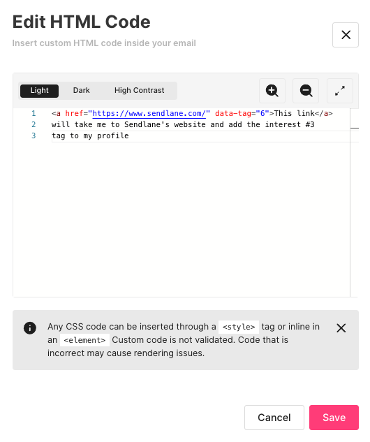 data-tagattribute with your tag's ID. In the following example, the URL ishttps://www.sendlane.com/, and the tag identifier is6: