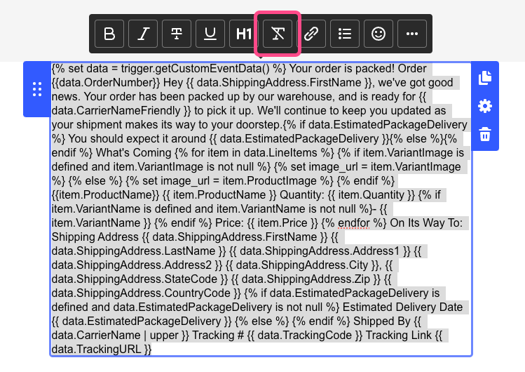 When you paste one of the templates below into the email builder, it may try to create hyperlinks for some data. This will cause an error that says "Unexpected token "operator" of value "". If you see any blue text after pasting, highlight all text and click the remove formatting icon. This should clear the error, and you should be able to save your email.