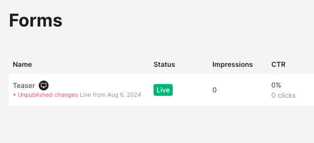 You’ll see a note on the Forms page that says “Unpublished changes” when a change has been made to a form that is set to Live or scheduled to be Live. This note means that the changes made to the form are not yet visible where the form is displayed.
