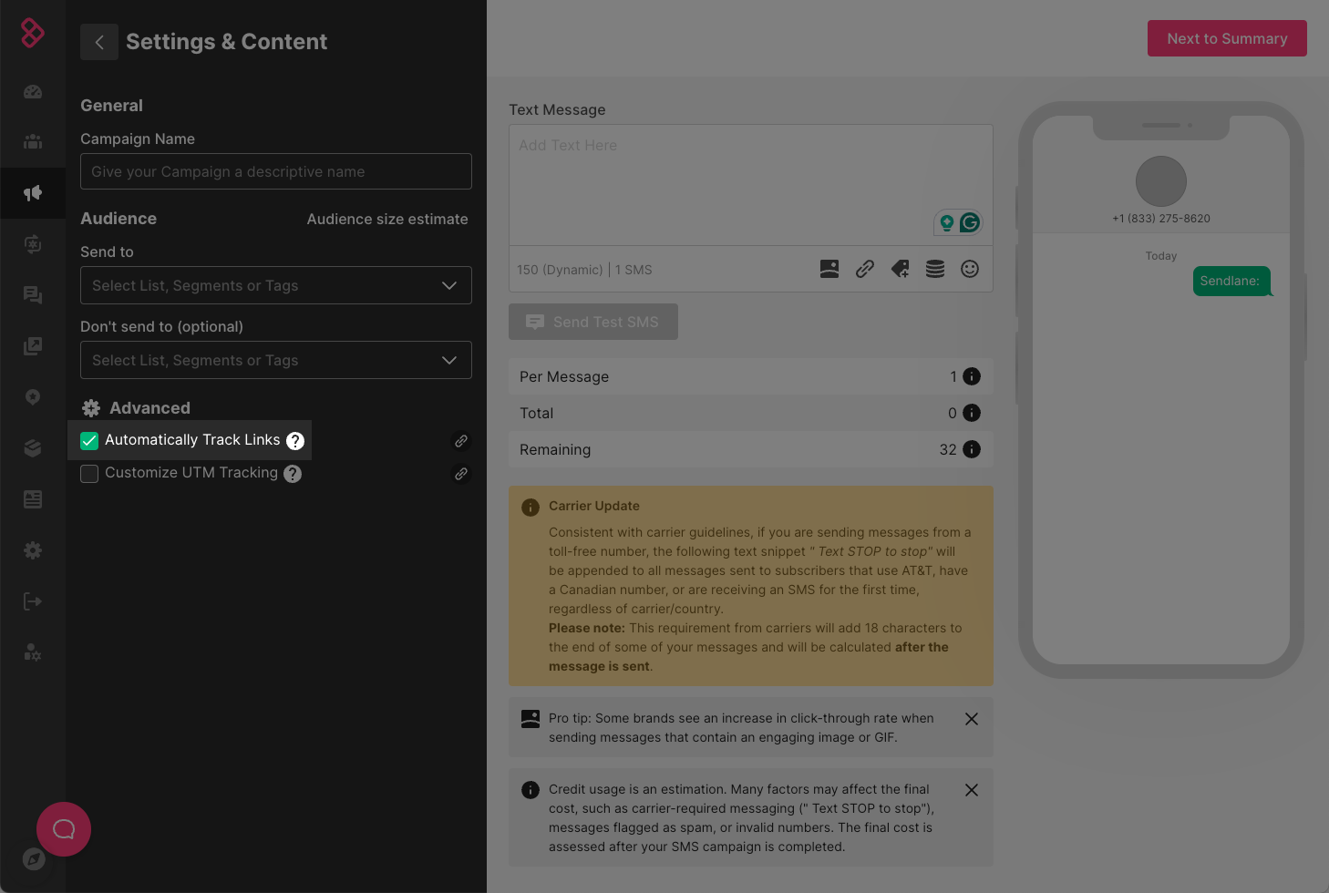Whether you check the Automatically Track Links checkbox or use the link builder, ensure the tracking link 1) appears in blue text in the Text Message box and 2) as a shortened link using your subdomain in the preview.
