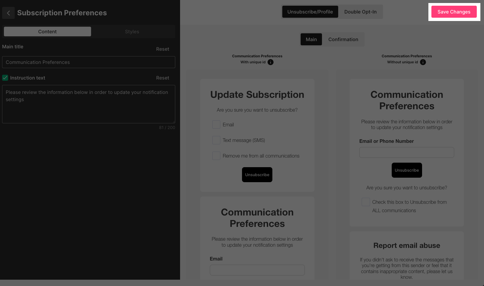 Unsubscribe/Profile Main For contacts who are already subscribed to update contact information, consent to receive email or SMS, and report abuse